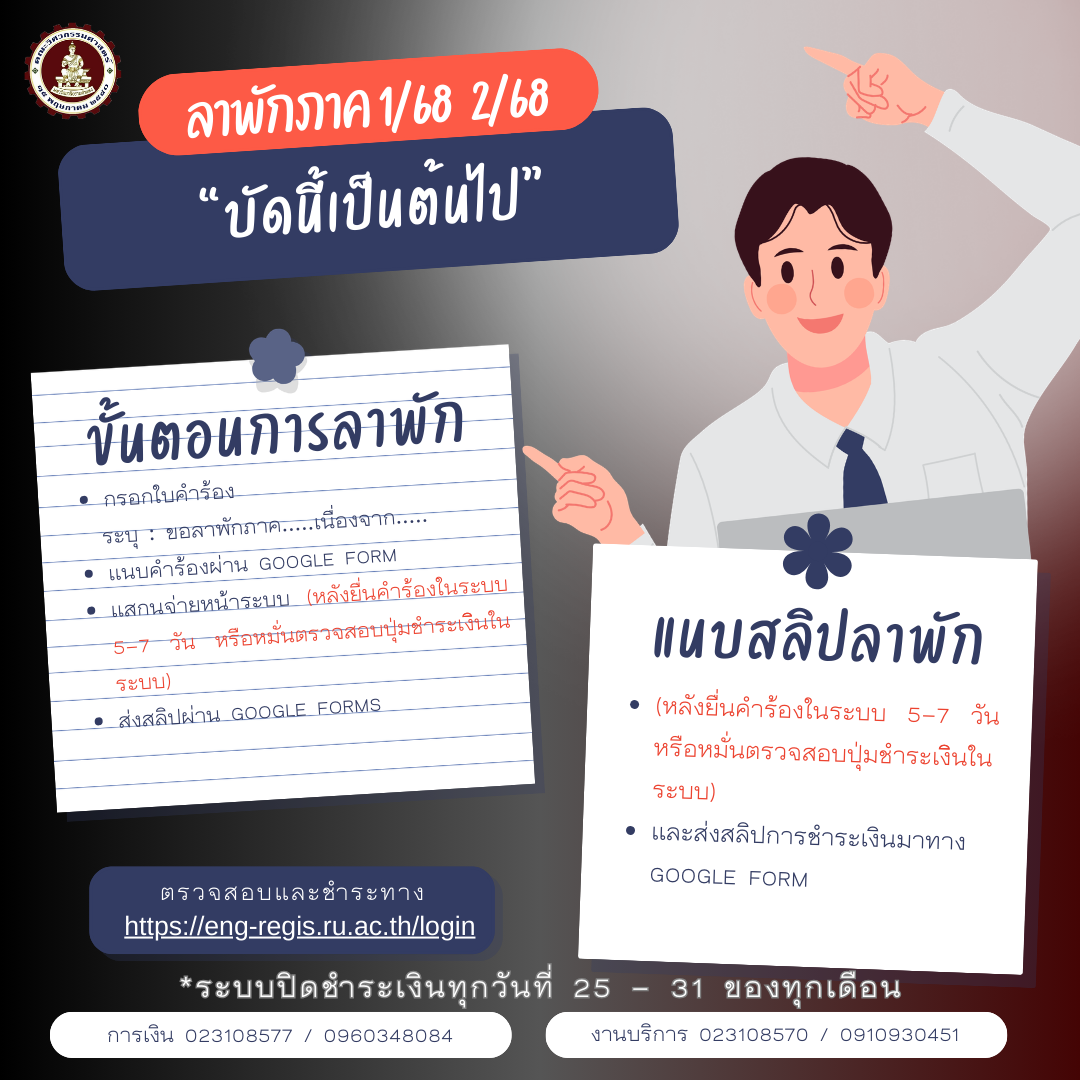 หลังยื่นคำร้องใน Google Form แล้ว 5-7 วัน หรือหมั่นตรวจสอบปุ่มชำระเงินในระบบ เมื่อมีปุ่มชำระเงินค่ารักษาสถานภาพ (ลาพัก) ขึ้น ให้นักศึกษากดชำระเงินค่ารักษาสถานภาพ (ลาพัก) และส่งสลิปการชำระเงินค่ารักษาสถานภาพ (ลาพัก) ทาง google form ส่งสลิปลาพัก จึงจะถือว่าการรักษาสถานภาพภาคเรียนนั้นๆ เสร็จสมบูรณ์